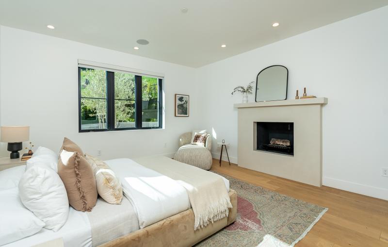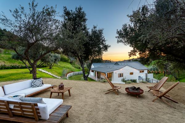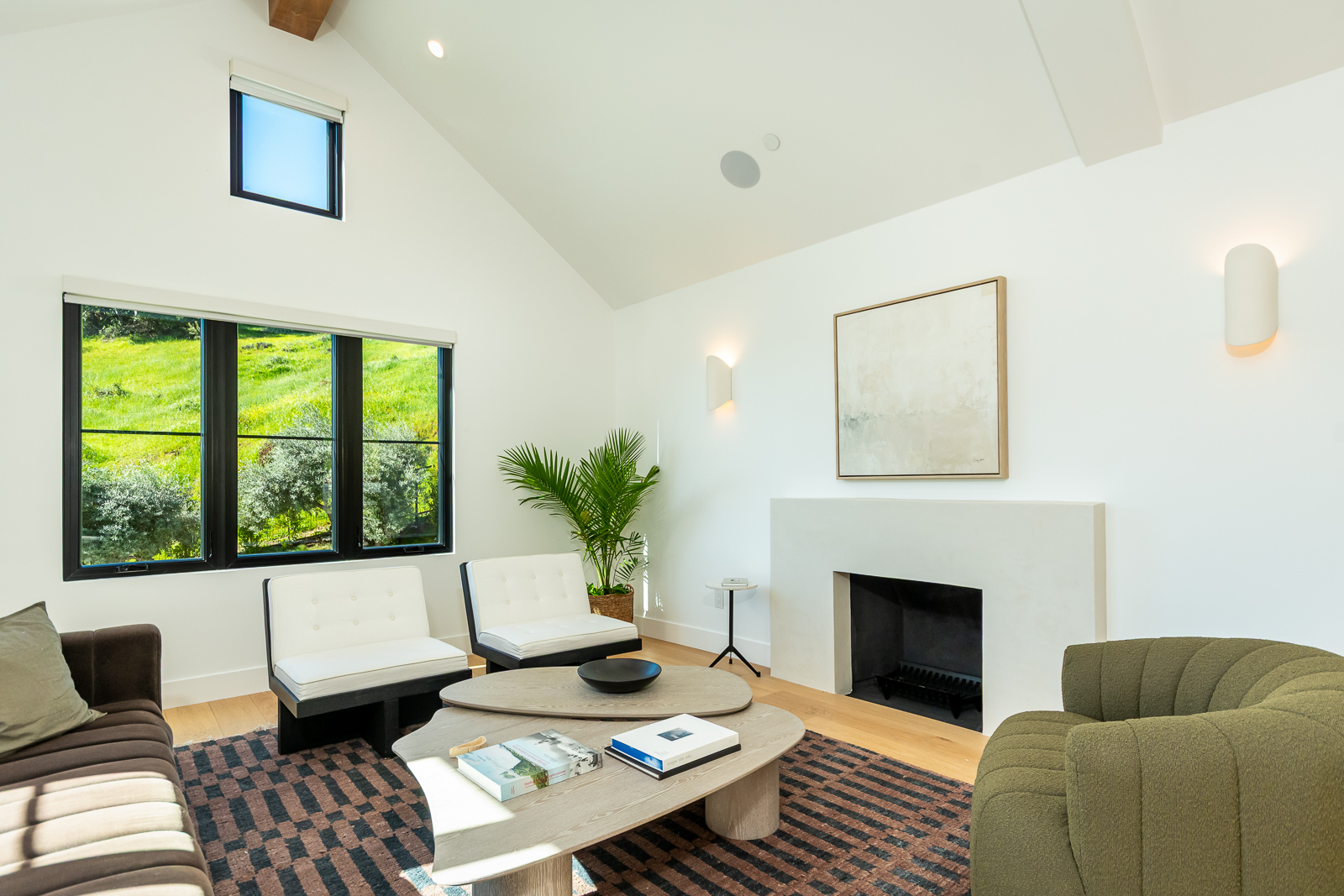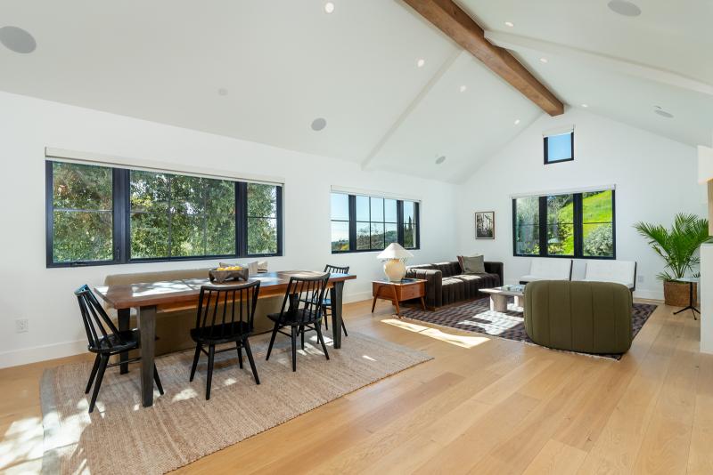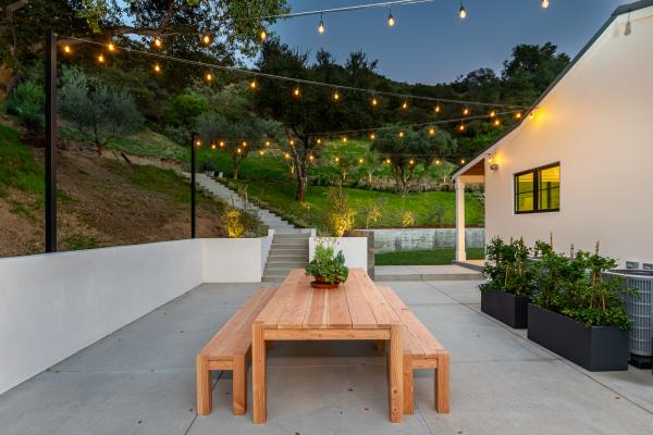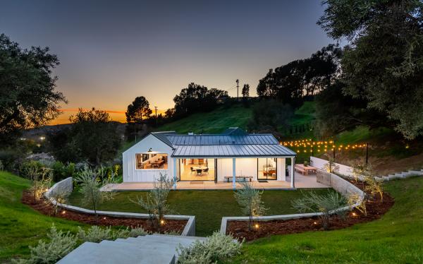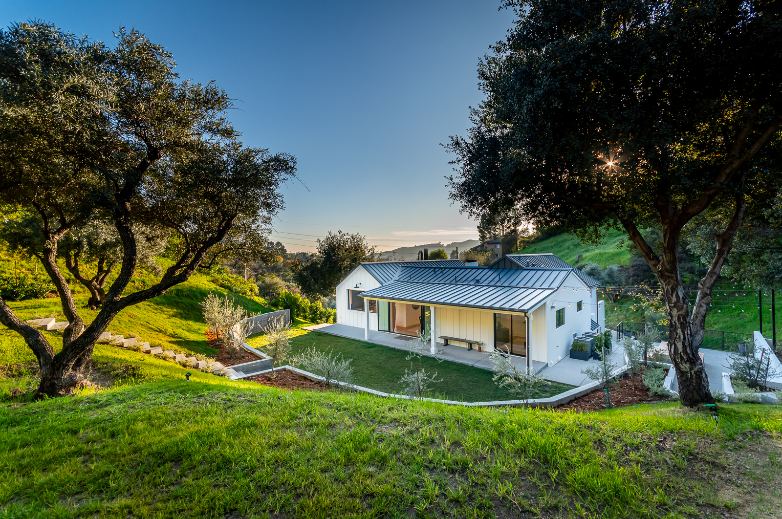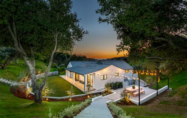 This elegantly redesigned Sonoma style farmhouse offers four bedrooms and five beautifully appointed bathrooms, blending timeless architecture with refined modern living. Thoughtfully designed interiors feature wide-plank white oak flooring and exceptional finishes throughout, creating a warm yet sophisticated atmosphere. Every space has been curated with attention to detail, from the gracious living areas to the serene bedroom suites, delivering both comfort and understated luxury. Designed for both everyday living and gracious entertaining, the home seamlessly blends classic farmhouse charm with contemporary luxury. Located at the end of a cul-de-sac with a gated perimeter this home offers over 4.5 acres of privacy, studded with mature olives trees and views of DTLA.